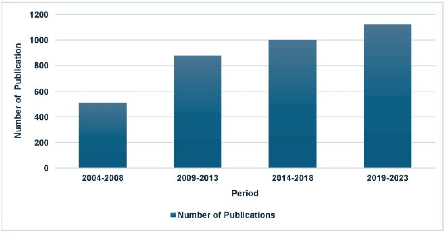 The period-wise growth of quantity of publications is shown in Figure 4. It was discovered that between the first period (2004-2008) and the last period (2019-2023), number of publications had increased. It demonstrated how Publications increased from 509 to 1122 with a CPGR of 30.14%.