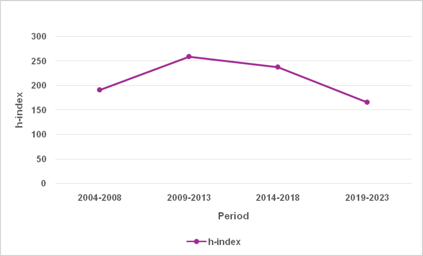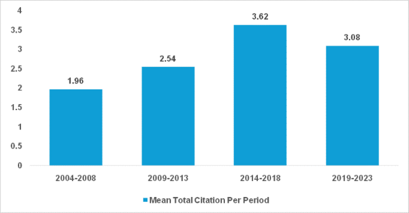 Figure 5 represents the h-index at successive periods. The citations of the papers, which indicate the publication’s productivity and quality, determine the h-index. Figure 6 represents the mean total citation per period. It was discovered that between the first period (2004-2008) and the third period (2014-2018), mean total citation per period had increased. The mean total citation per period increased from 1.96 during the first period (2004-2008) to 3.62 during the third period (2014-2018) then had decreased to 3.08 during the last period (2019-2023).