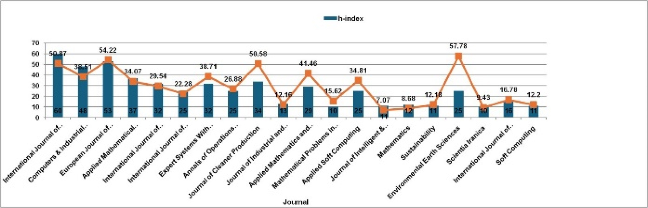 Figure 8 represents ACPP and h-indices of the top 20 journals, considering the quantity of publications. The average of ACPP of the top 20 productive journals is 28.69, which is a little bit higher than the ACPP (21.1) of total journals. The Environmental Earth Sciences has the highest ACPP of 57.78 followed by European Journal of Operation Research with an ACPP of 54.22, International Journal of Production Economics with an ACPP of 50.87, Journal of Cleaner of Production with an ACPP of 50.58. It has been discovered that another sixteen journals scored an ACPP of less than 50. The average of h-index of the top 20 journals is 25.95. The International Journal of Production Economics has the highest h-index of 60, followed by European Journal of Operation Research with an h-index of 53, and Computers and Industrial Engineering has an h-index of 48. It has also been discovered that another seventeen journals scored an h-index of less than 40.