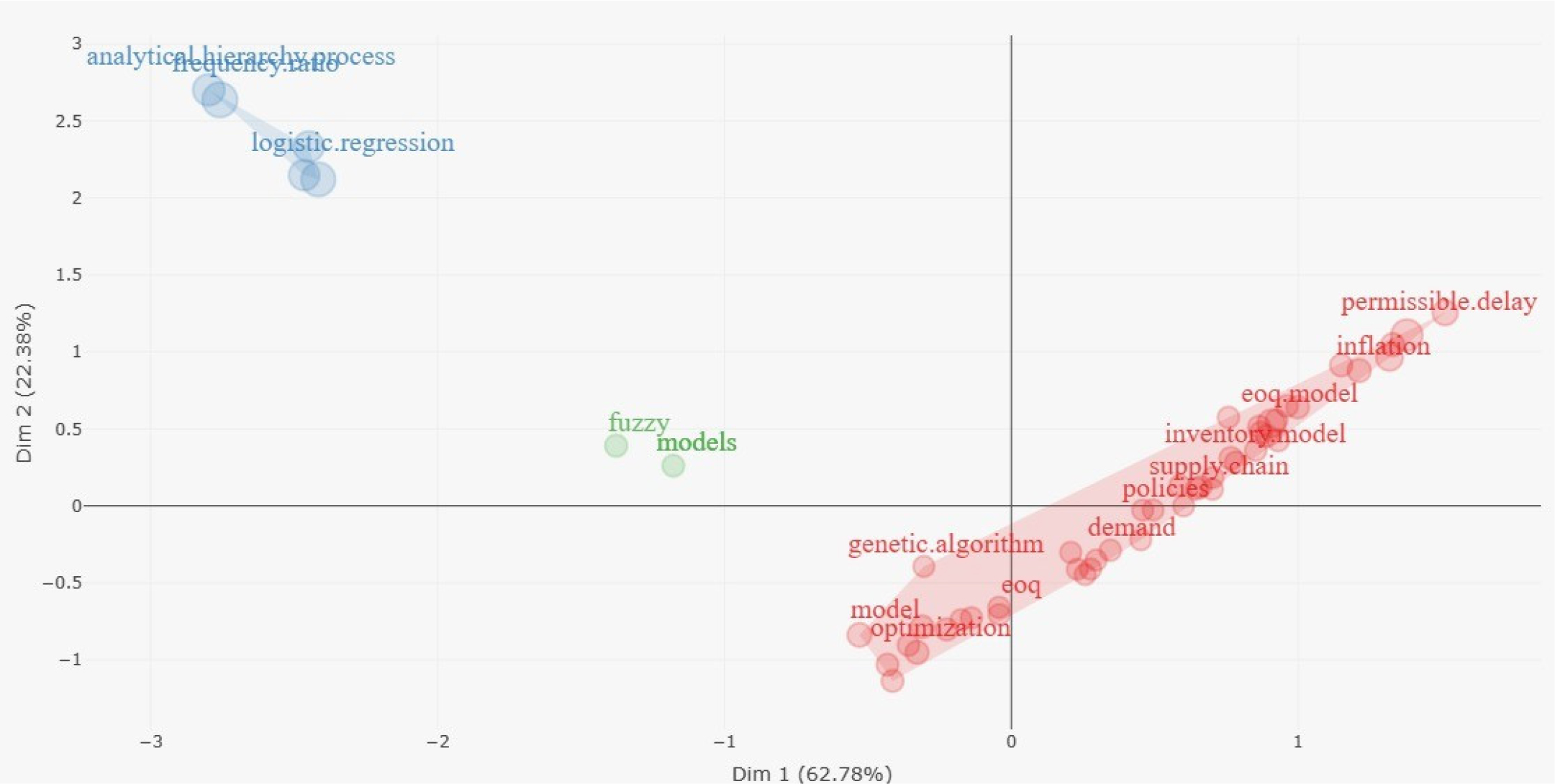 Cluster 1 this cluster is the biggest cluster with 44 keywords including the most frequently occurring terms like EOQ Model, Inventory model, Supply chain, Lot-Size, Shortages, Landslide, Demand, Permissible Delay and Deteriorating items. The most significant cluster is represented by this cluster. Cluster 2 this cluster is the small cluster with 5 keywords including the occurring terms like Logistics regression, Frequency ratio and Analytical hierarchy process.