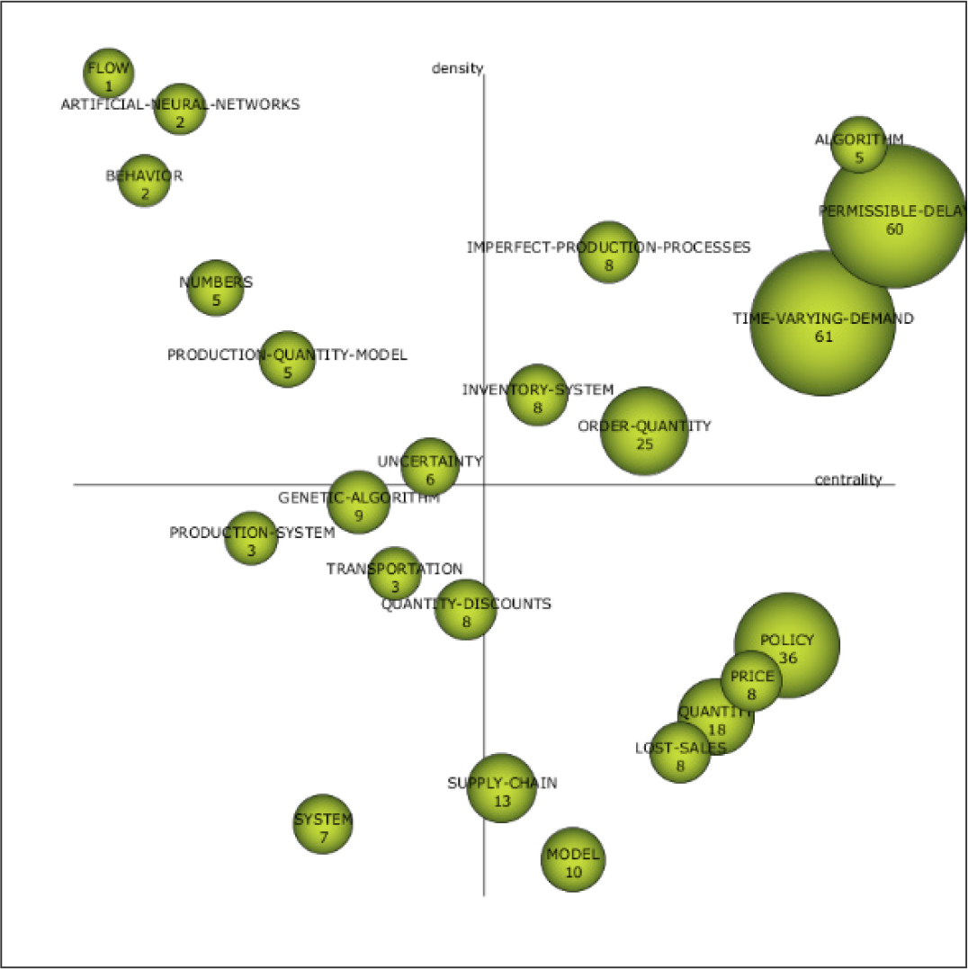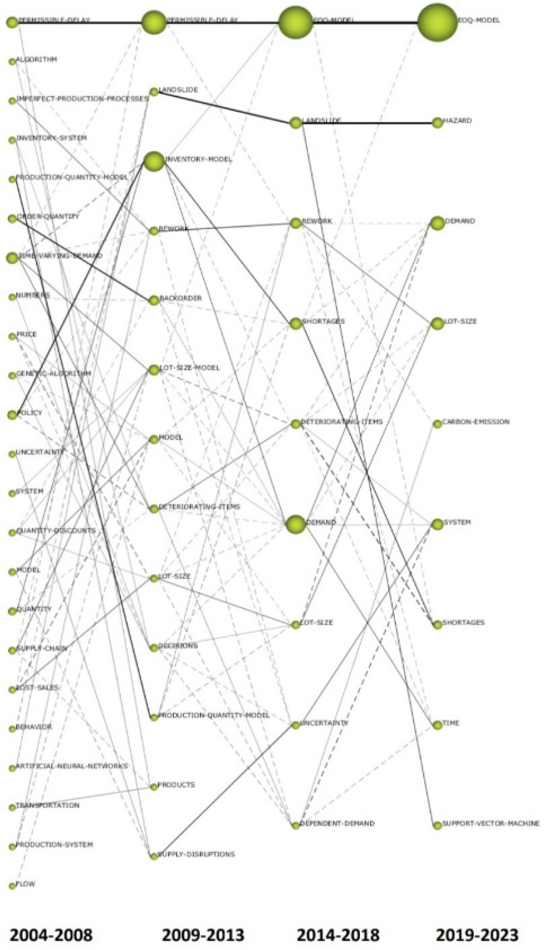 The Figure 15 represents the thematic evolution. For every period listed below its assigned column, a different theme was plotted in a column. The number of published documents linked to each theme cluster determines the size of the node representing that theme cluster. Links are used to connect themes that have a relationship between different periods. The Inclusion Index, which can be defined as the degree of commonly distributed keywords between two theme clusters, is directly correlated with the thickness of the link. While broken line links show theme clusters sharing keywords with topics that are not the main item, solid line links show the linked theme cluster sharing the main keywords with topics. Twenty one themes, including “PERMISSIBLE- DELAY”,“ALGORITHM”,“IMPERFECT-PRODUCTION-PROCESSES”, “INVENTORY-SYSTEM”, “PRODUCTION-QUANTITY-MODEL”,“ORDER-QUANTITY”,“TIME- VARYING-DEMAND”,“NUMBERS”,“PRICE”,“GENETIC ALGORITHM”,“POLICY”,“UNCERTAINTY”,“SYSTEM”, “QUANTITY-DISCOUNTS”,“MODEL”,“QUANTITY”, “SUPPLY-CHAIN”,“LOST-SALES”,“ ARTIFICIAL-NEURAL-NETWORKS”, “TRANSPORTATION” and “PRODUCTION-SYSTEM” have a strong connection to the themes of the following period, indicating the persistence of the associated keywords in relation to topics. Among these themes, only three “PERMISSIBLE-DELAY”, “PRODUCTION-QUANTITY-MODEL” and “MODEL” have surfaced in the subsequent time frame. The themes “PERMISSIBLE-DELAY”,“LANDSLIDE”,“INVENTORY- MODEL”,“REWORK”,“BACKORDER”,“MODEL”,“DETERIORATING- ITEMS”,“LOT-SIZE”,“DECISIONS”,“PRODUCTION-QUANTITY- MODEL” and “SUPPLY-DISRUPTIONS” served as transitional themes that shared the main topics between 2009 and 2013.Fix themes “LANDSLIDE”,“REWORK”,“DETERIORATING-ITEMS” and “LOT-SIZE” served as thematic link between those who received topics from the previous period and those who shared the main topics of the next period from 2014 to 2018.During the end period, “EOQ-MODEL” has emerged as the primary topic followed by “DEMAND” and “LOT-SIZE”. During 2014-2018, some themes have transformed into new themes during 2019-2023 namely, “HAZARD”, “CARBON-EMISSION”, “SYSTEM”, “TIME” and “SUPPORT-VECTOR-MACHINE”.