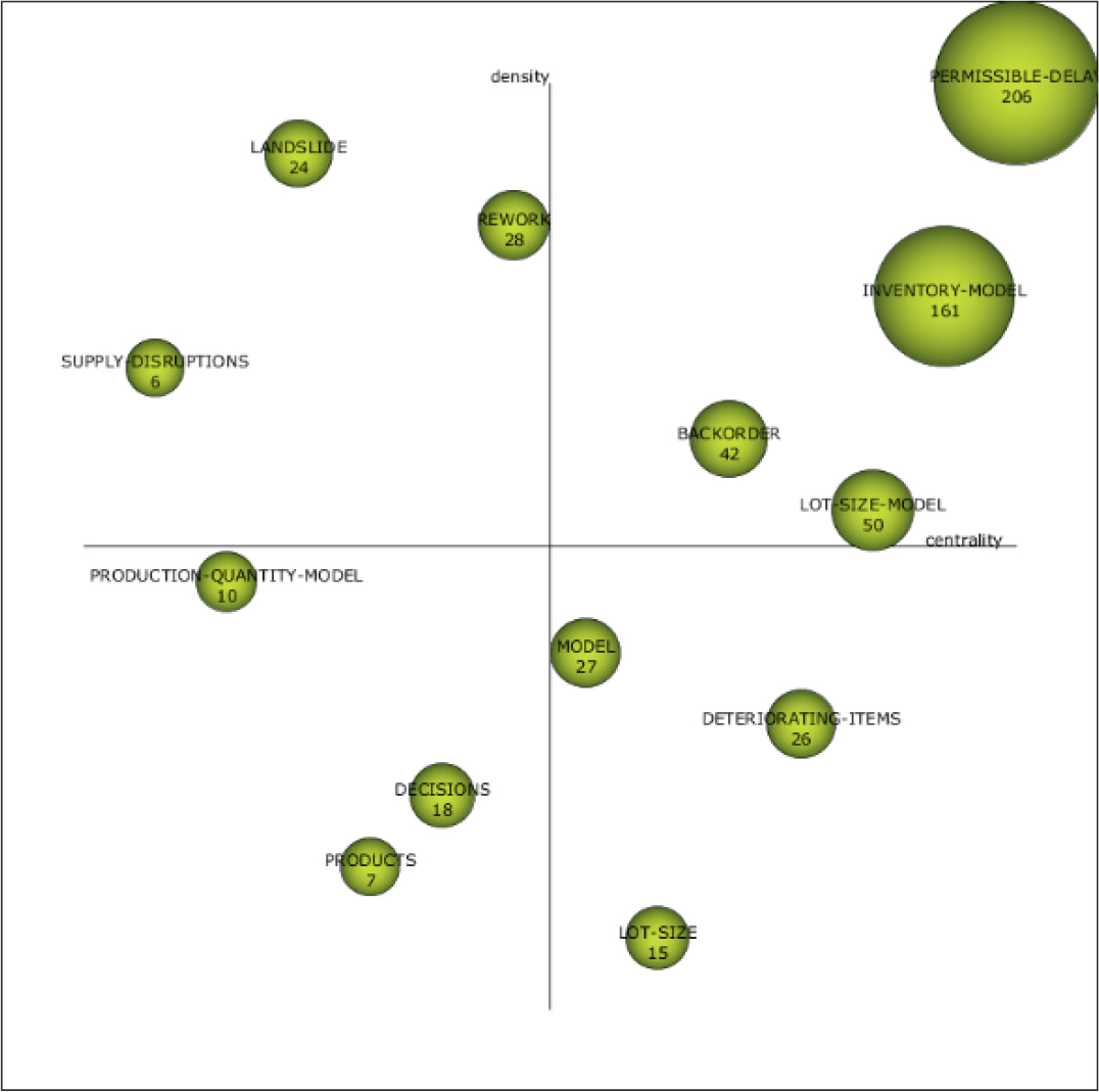 During the first period and 2009-2013 period, “PERMISSIBLE-DELAY” was the dominant theme. In light of inflation, allowable payment delays, and customer returns, a top cited paper developed an economic ordering policy model for non-instantaneously deteriorating items with selling demand driven by price and inflation in the first period (Ghoreishi et al., 2015). During the period 2009-2013, “PERMISSIBLE-DELAY” was positioned in same dominant theme. An EPQ type inventory model with planned backorders was developed in a highly cited paper between 2009 and 2013 to determine the economic production quantity for a single product (C´ardenas-Barr´on, 2009).