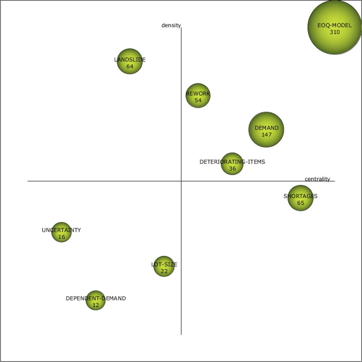 During the period 2004-2008, the “PRODUCTION-QUANTITY-MODEL” was positioned in “highly developed and isolated themes”. During this time, a top cited paper established practical necessity and possibility constraints within the framework of a multi-item dynamic production-inventory control system (Maity and Maiti, 2007). During the period 2009-2013, the “PRODUCTION-QUANTITY-MODEL” was sifted in “emerging themes”. In this period, A two-warehouse inventory model with imperfect quality production processes (Chung et al., 2009) was established in a top cited paper. During the first period and 2009-2013 period, “MODEL” was “basic and transversal theme”. In the first period, the topic of figuring out the economic order quantity in the context of a reasonable payment delay was covered in a top cited paper (Chung et al., 2005). During 2009-2013 period, “MODEL” was positioned in the same “basic and transversal themes”. In this period, a case from the Tinau watershed in west Nepal was examined using the “analytical hierarchy process (AHP)” for mapping the vulnerability to landslides (Kayastha et al., 2013) in a top cited paper.