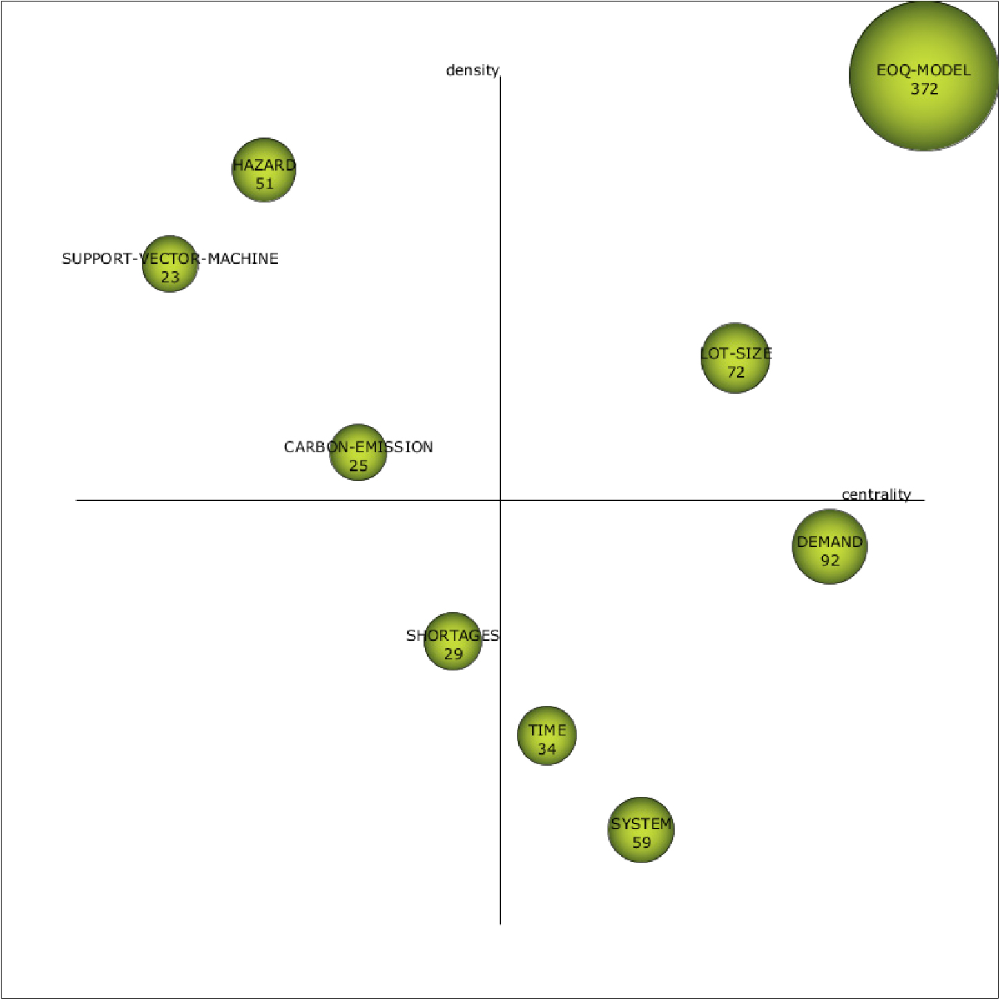 During 2014-2018 period, “SHORTAGES” was the “basic and transversal theme”. In this period, an inventory model for deteriorating items under a two-level partial trade credits in supply chain with allowable shortages (Tiwari et al., 2018) was developed in a top cited paper. During 2019-2023 period, “SHORTAGES” was sifted in “emerging themes”. In this period, “quality control and green production policies” were taken into consideration when designing a bi-objective, multi-product, constrained, integrated EPQ model (Gharaei et al., 2021) in a top cited paper.