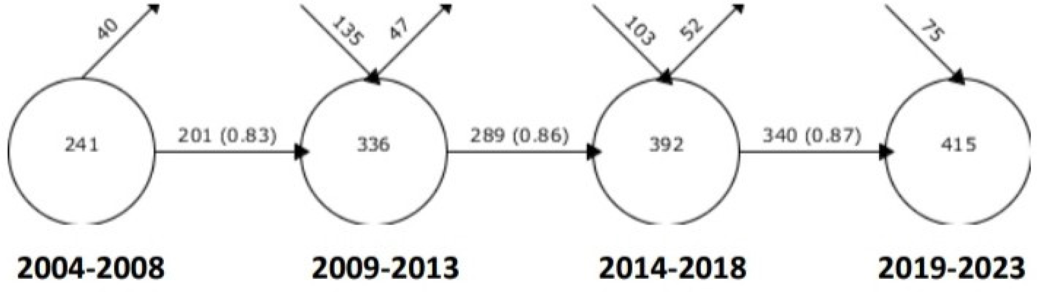 In the opposite direction, the outward-pointing arrow denotes the quantity of terms that remain unutilized throughout time. A arrow pointing from one period to the next signifies the integer value of the quantity of keywords transferred and the percentage of overlap in brackets (also known as the Similarity Index).The greater similarity index value suggests that primary themes are more or less constant, whereas the number of recently developed keywords shows how the central idea is developed in various sub-themes. With a CPGR of 19.86%, the number of keywords increased from 241 in the first period to 415 in the most recent one. The percentages of new keywords have been added to the worldwide percentages (40.18% during 2009-2013, 26.27% during 2014-2018, 18.07% during 2019-2023).