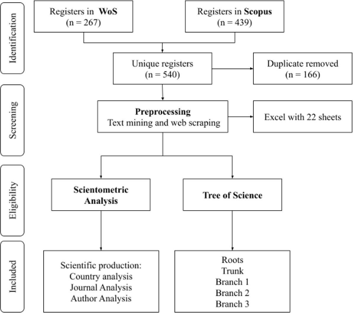 This study employed a scientometric analysis to identify significant research related to the Figure of the teacher-researcher. The methodology underpinning this study is based on research within the WoS and Scopus databases. Notably, to execute this, it was necessary to merge and measure these databases through the development of Exploratory Data Analysis (EDA) using scientometric tools such as Bibliometrix (Aria and Cuccurullo, 2017). These tools facilitate the grouping of relevant data and references. This approach provides a comprehensive description of recent studies and enables a more efficient bibliometric analysis of the studied variable.