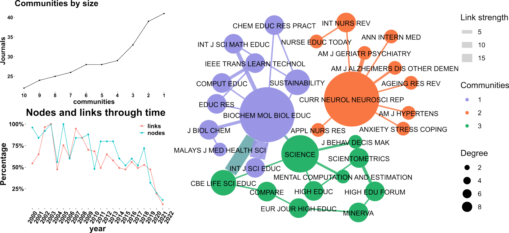 Figure 4 presents a citation network of journals, delineating three principal thematic clusters. The first cluster (depicted in orange) encompasses journals that focus on education within specific disciplines, such as mathematics or biology. The second cluster (illustrated in green) comprises medical journals, reflecting the academic literature’s emphasis on the research-teaching paradigm from a caregiving perspective (Merrilees, 2016). The third cluster (represented in purple) pertains more to the field of education sciences, signifying studies that explore the intersection of research and teaching (Reid and Gardner, 2020).