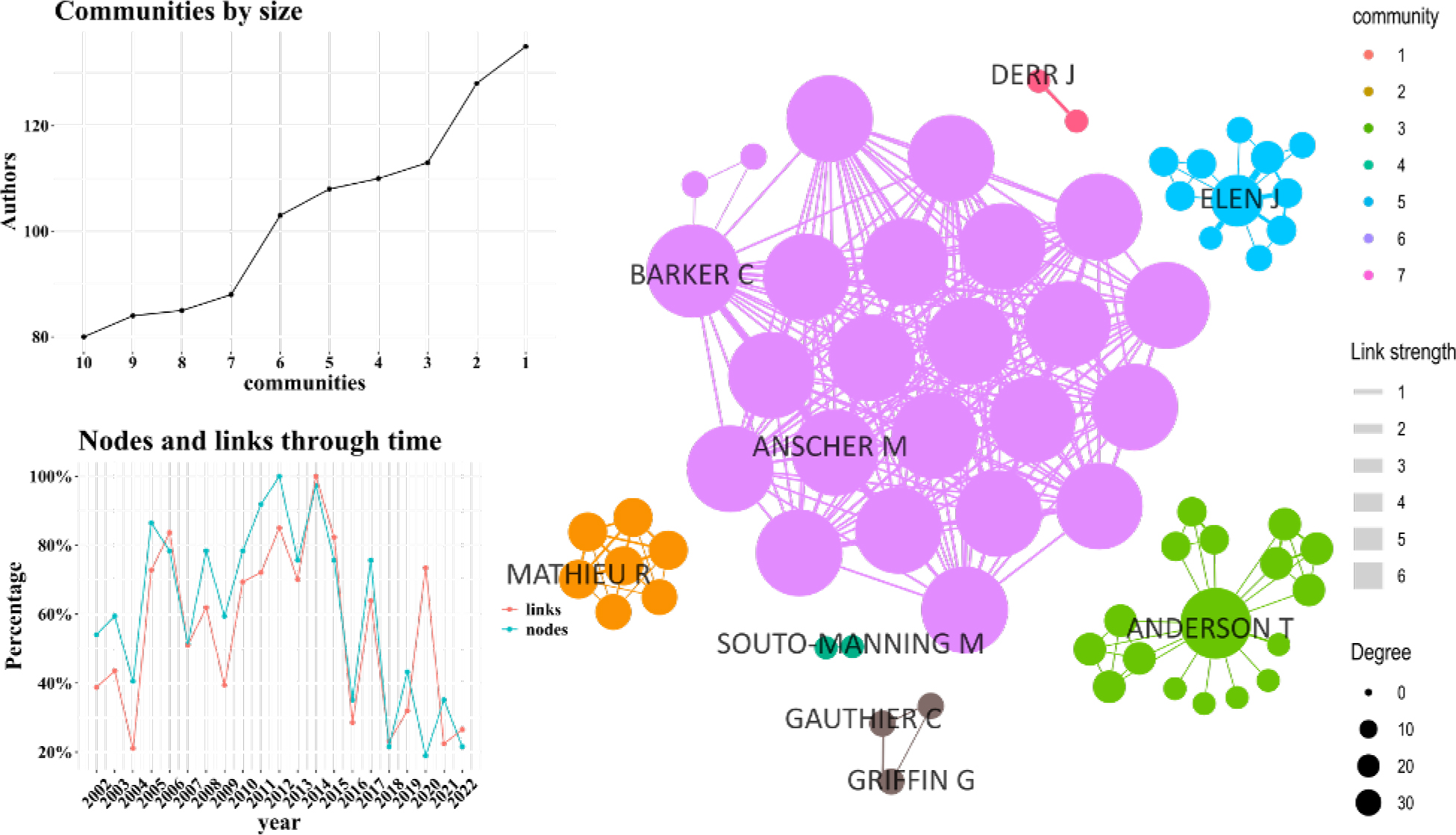 Figure 5 presents the scientific collaboration network of authors with the most research. It is observed that there is a community around Professors Anscher and Barker, possibly due to their thematic affinity around health topics (Wallner et al., 2014), which also causes it to be a community that clearly differentiates itself from others. Additionally, only Professors Gauthier and Griffin appear with scientific collaborations due to their thematic affinity to animal research (Griffin and Gauthier, 2004) and geographical proximity.