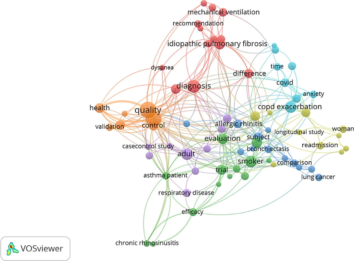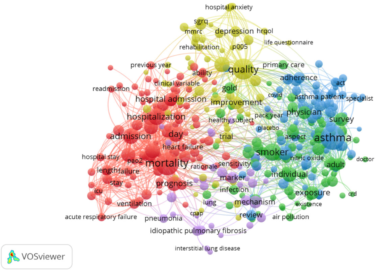 In Figure 3, 73 keywords appearing over five times were grouped into seven clusters, with node size indicating frequency. Keywords in titles and abstracts reveal a paper’s main ideas. From 352 keywords appearing over ten times, five clusters were identified (Figure 4). The blue and purple clusters mainly include chronic respiratory disease names like asthma and interstitial lung disease. The green cluster includes smoker, nitric oxide, and air pollution. The red and yellow clusters focus on CRD management, with terms like improvement and hospital admission, while depression appears in the red cluster, highlighting the importance of managing psychological symptoms.