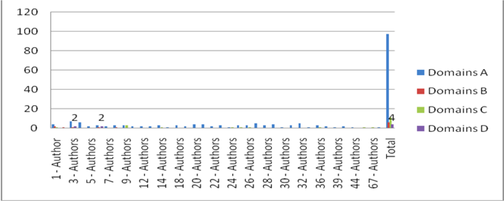 | No. of authors | Domains | Total no. of Papers | % | Total no. of Authorship | % | |||