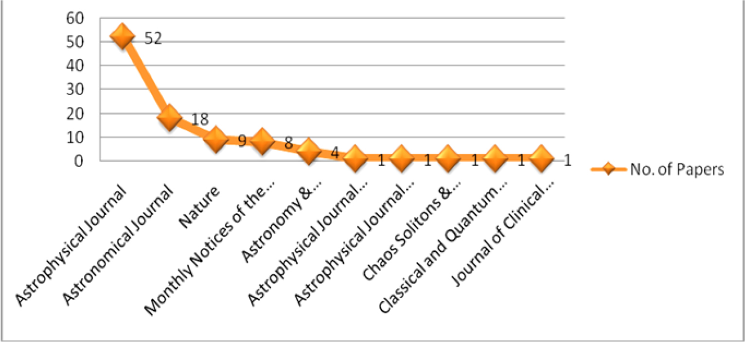 Distribution of Brian P Schmidt’s 118 publications was in 18 journals and 14 in books / chapters and conference proceedings. Journal-wise scattering of publications of Brian P Schmidt is provided in Table 3. Top ranking journals with a number of publications are: Astrophysical Journal (52), Astronomical Journal (18), Nature (9) and Monthly Notices of the Royal Astronomical Society (8).